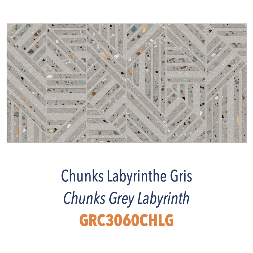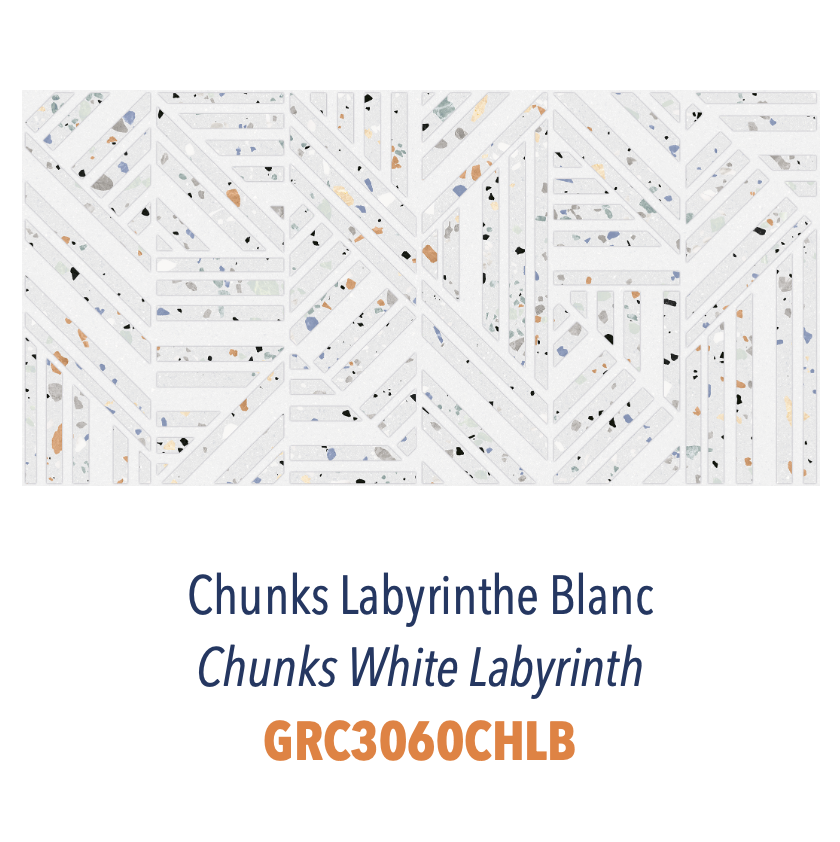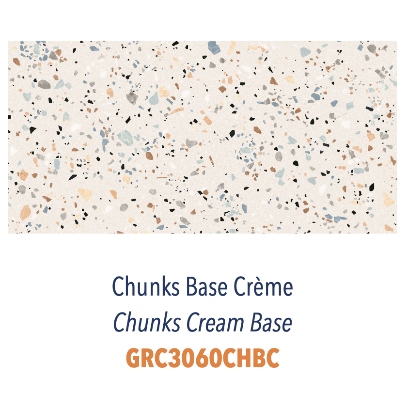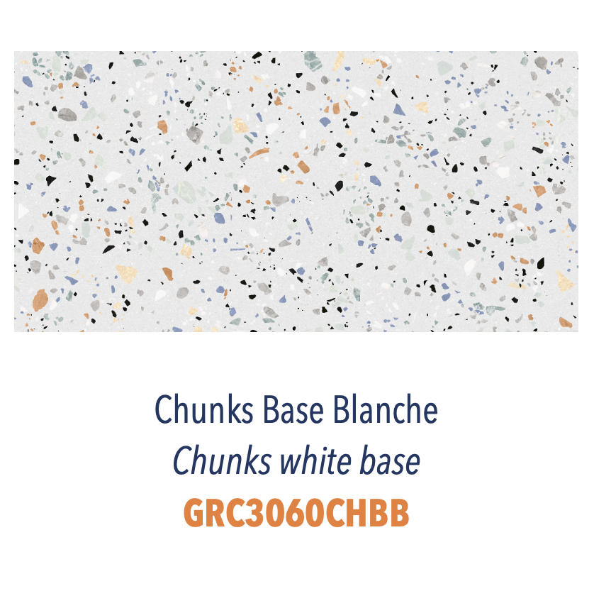 Inspiré par le charme artisanal du terrazzo traditionnel, Chunks propose une surface texturée et riche en détails. Chaque carreau capture l'essence du terrazzo avec un jeu de fragments soigneusement dispersés, offrant un rendu authentique et raffiné.