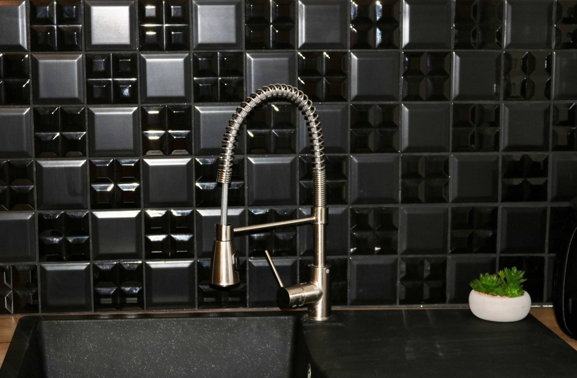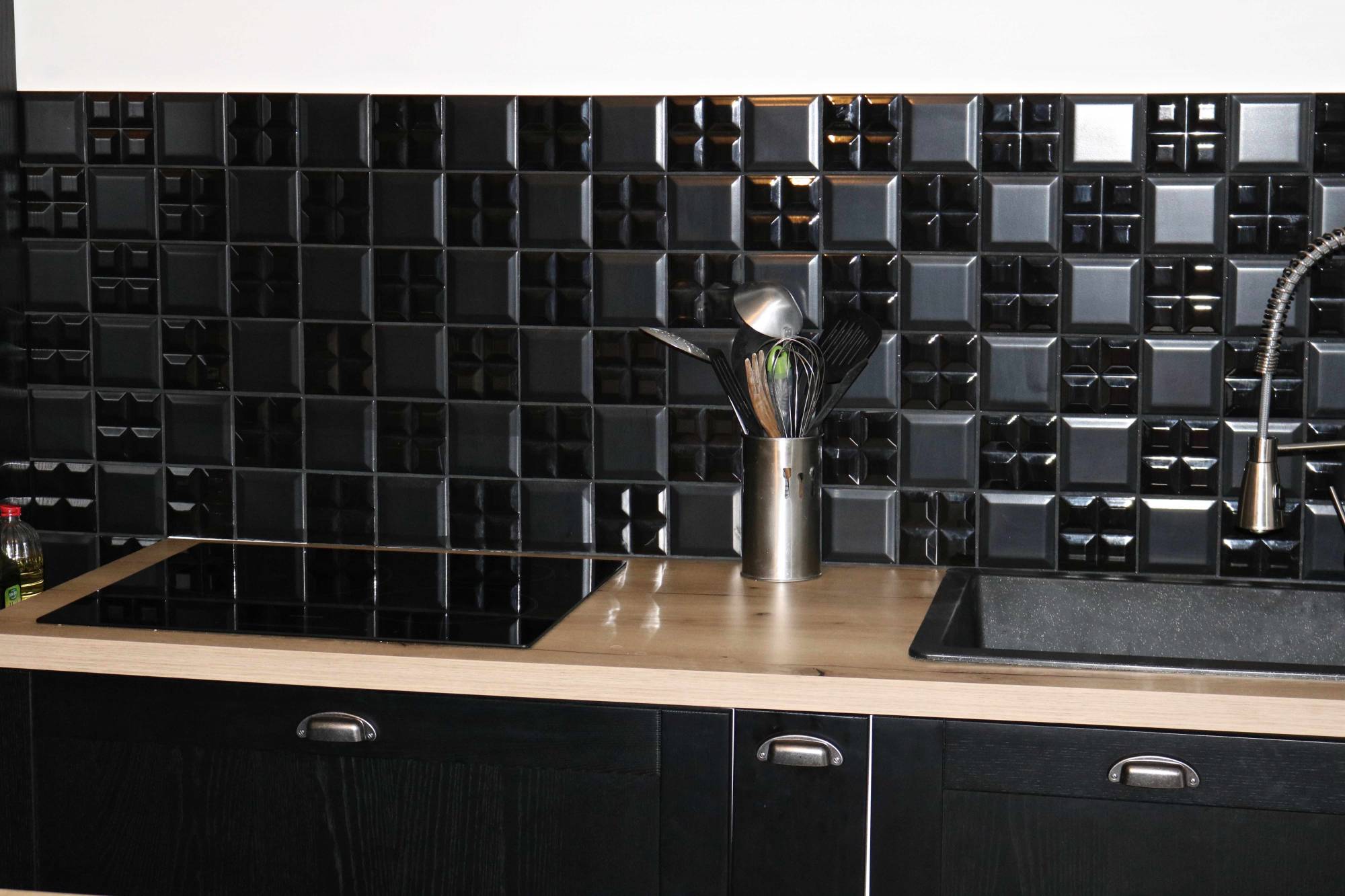 Superbe cuisine! La crédence a été réalisé avec des carreaux de la collection Metro New York. Les carreaux Rockefeller Noir Brillant sont posés en quinconces avec les carreaux Brooklyn Noir Mat. Le mélange de biseaux et le jeu de lumières entre le brillant et le mat rendent cette cuisine tellement tendance!