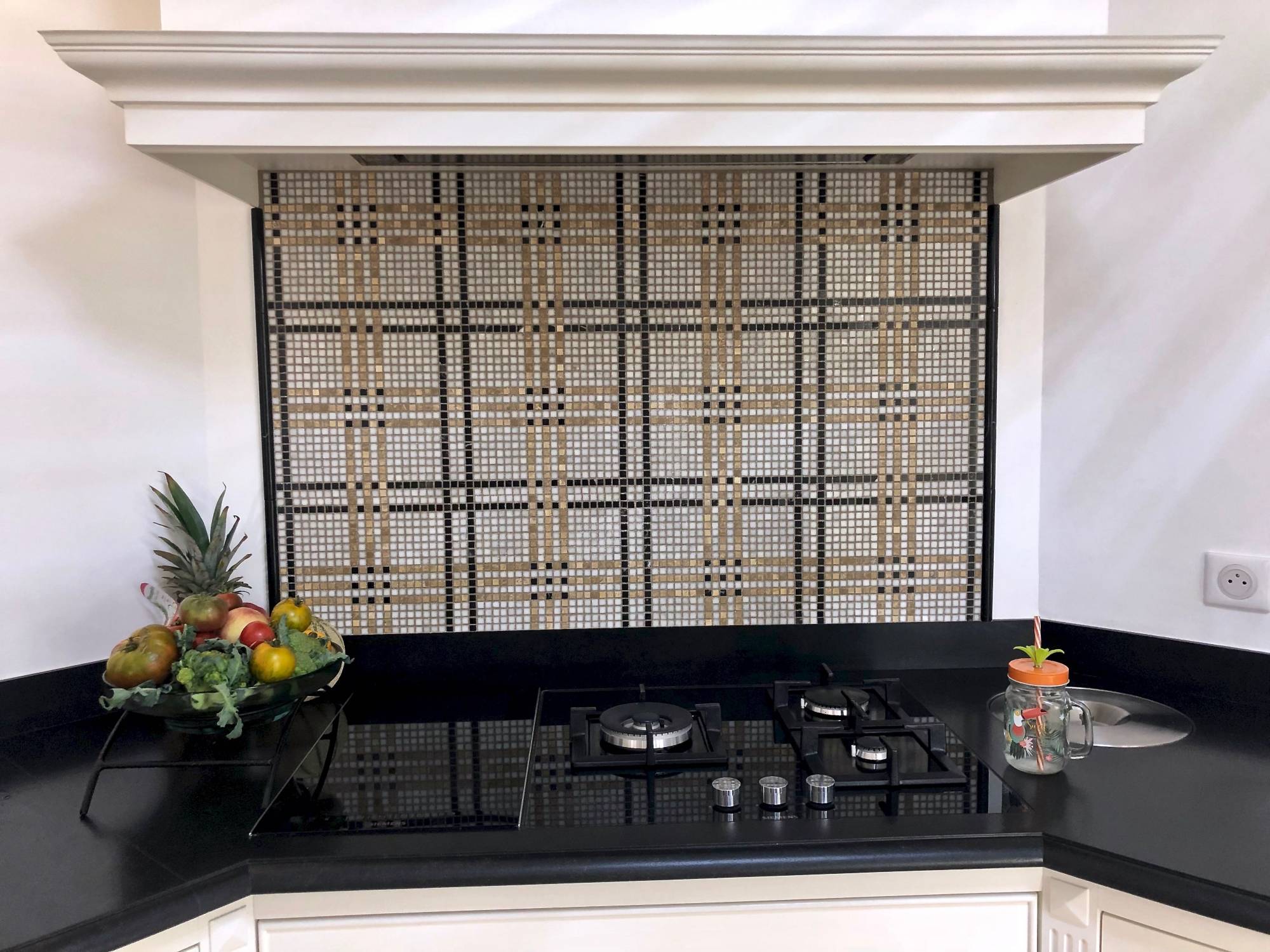 Les plaques de mosaïques de marbre en 30 x 30 cm sont posées des plaques de cuisson jusqu'à la hotte pour protéger entièrement le mur et des moulures en marbre noir sont placées de chaque coté de la crédence pour des finitions parfaites et pour rappeler le noir du plan de travail en pierre naturelle du Zimbabwe.