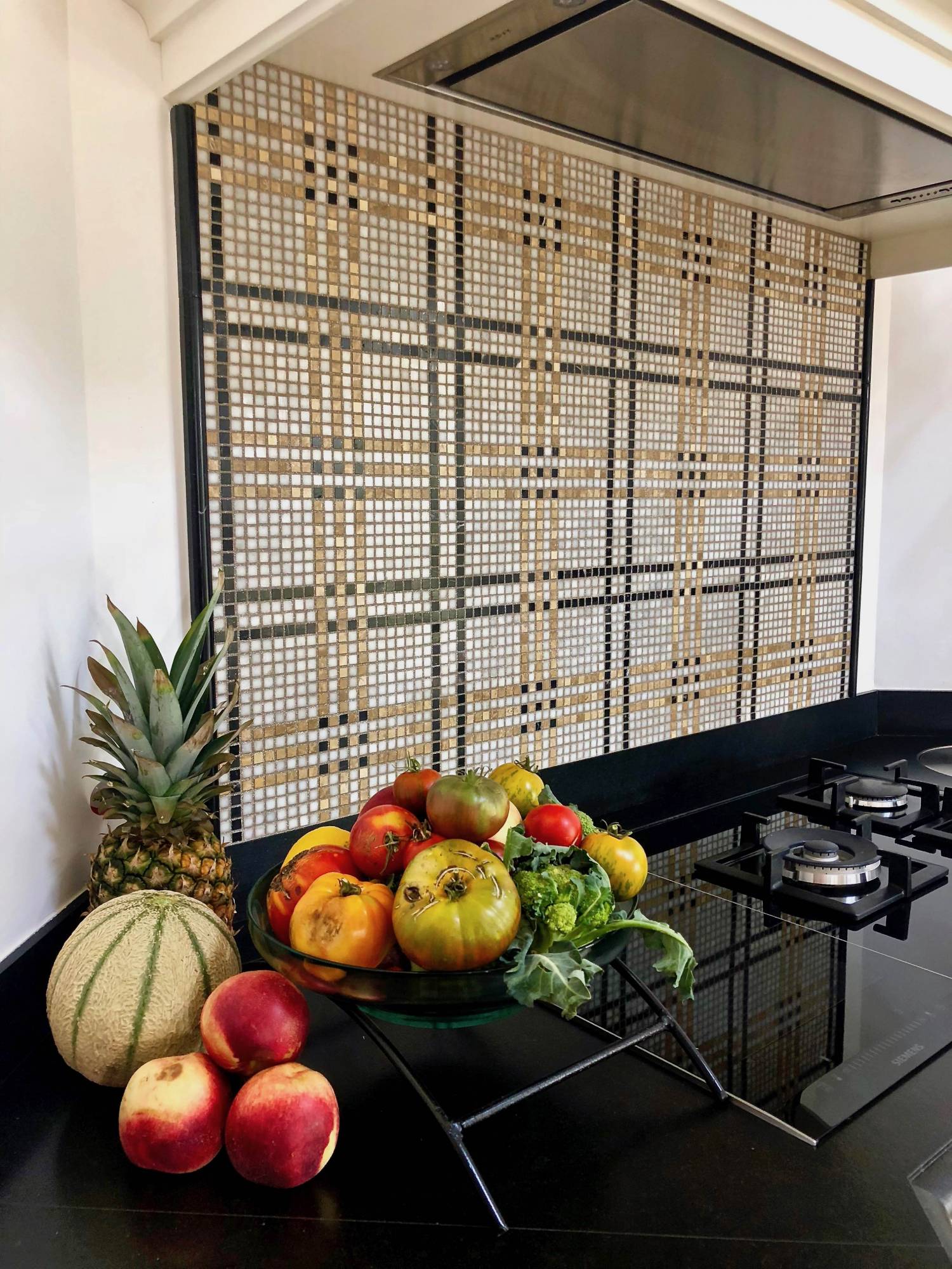 Notre mosaïque de marbre Tartan en blanc, noir et beige est utilisée pour protéger le mur des projections de graisse, d'huile, d'eau... lors de la cuisson. Ce mur en marbre est donc indispensable et pratique mais est aussi un élément de décoration majeur dans cette cuisine!