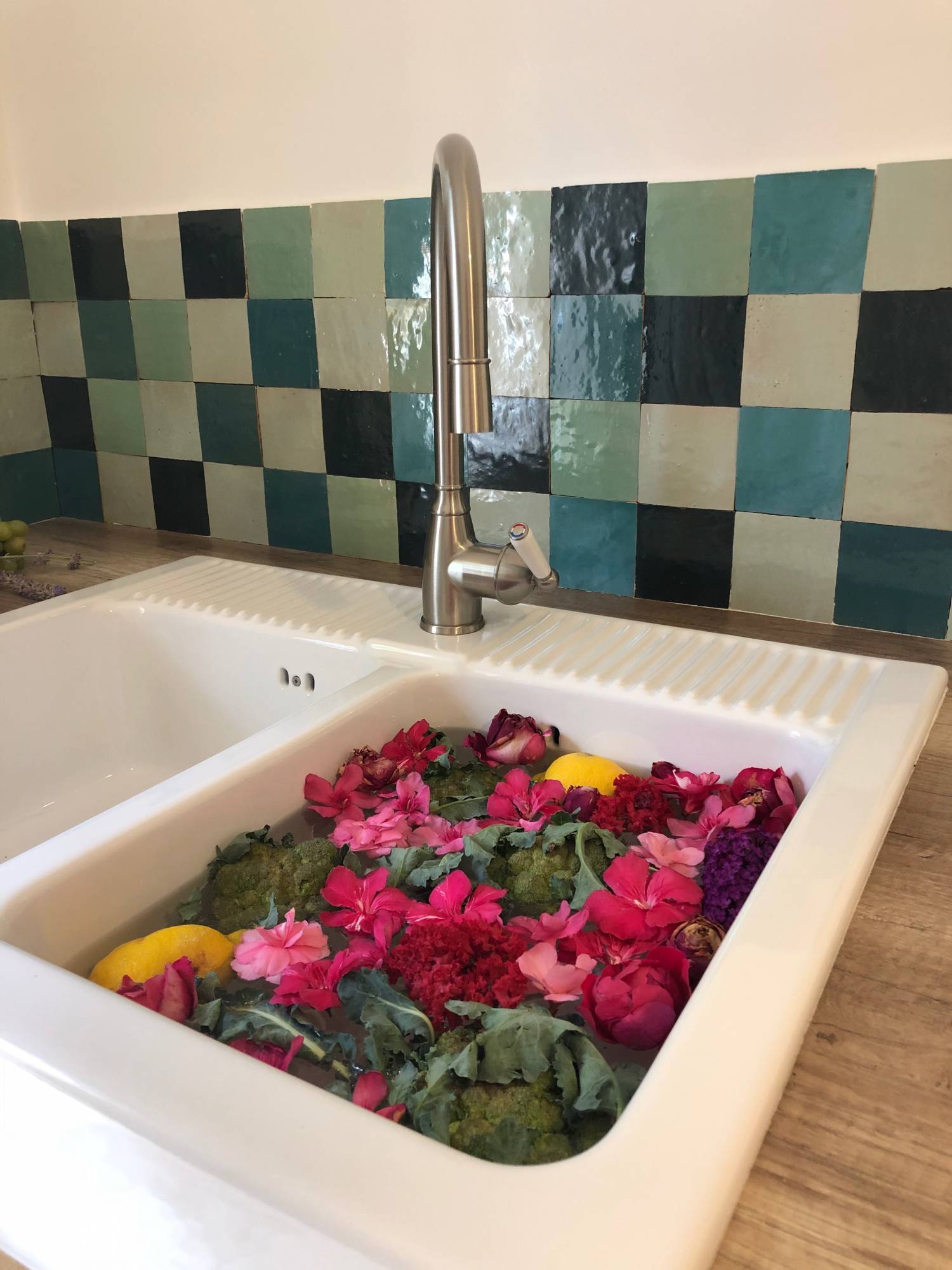 La très jolie crédence de cette buanderie a été réalisée avec 5 couleurs différentes de carreaux Zellige en 10 x 10 cm. Ce patchwork dans les tons verts et bleus est très réussi, il est très facile de faire un patchwork de différentes couleurs avec les carreaux Zellige car ces derniers ont toujours des reflets très différents d'un carreau à l'autre et donc l'harmonie des teintes et lumières est toujours là.