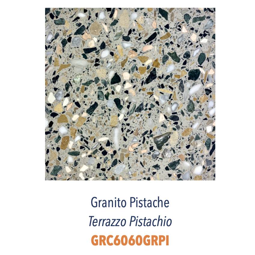 - Pistache : Base résine gris clair avec agrégats vert, rose, ocre, noir et blanc