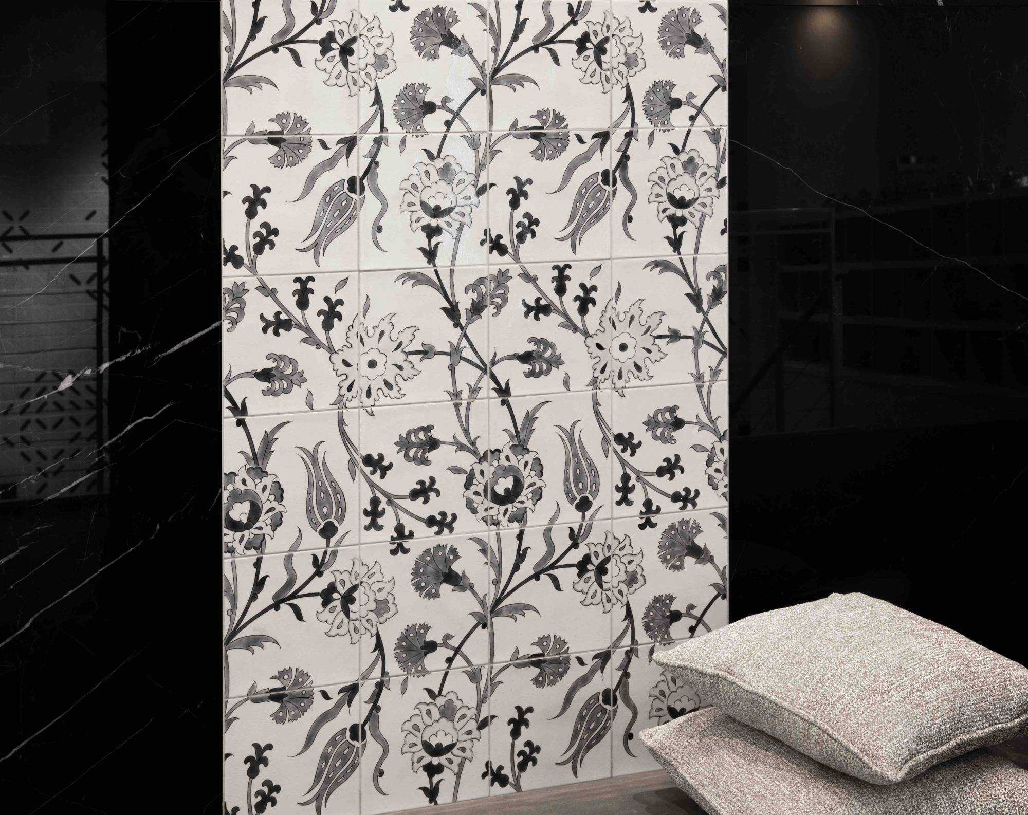 Réinterprétée dans une version plus contemporaine en noir et blanc, la fresque Marmara révèle toute son élégance et sa sobriété.