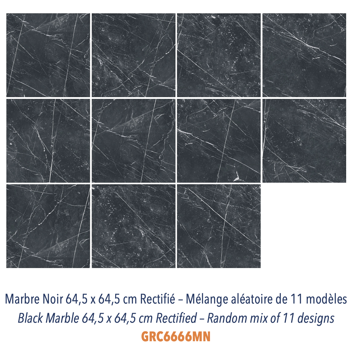 Ces carreaux en grès cérame ont un fini satiné tout comme un marbre avec une finition mate. Ils sont disponibles en deux couleurs : Noir et Blanc Carrara et dans deux formats: 25 x 25 cm et 64,5 x 64,5 cm.