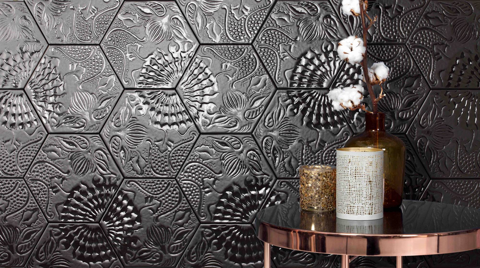 Deux types d'émail sont utilisés sur un même carreau. Le fond du carreau est émaillé avec un fini satiné alors que les motifs sont couverts d'un émail brillant ce qui donne un effet de profondeur et de texture incroyable au carreau!