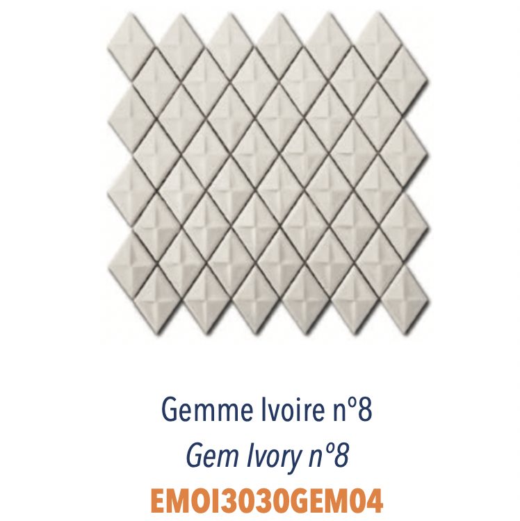 Les petits losanges de nos mosaïques Gemme ont un léger relief qui permettra de créer un superbe jeu de lumières sur vos murs.
