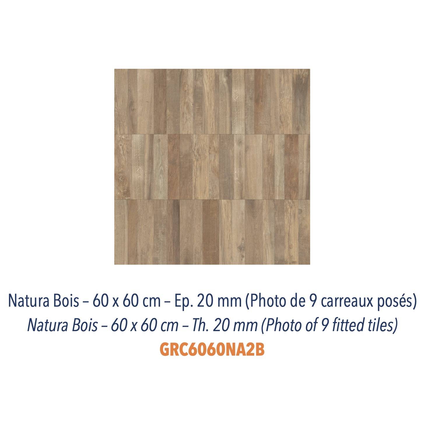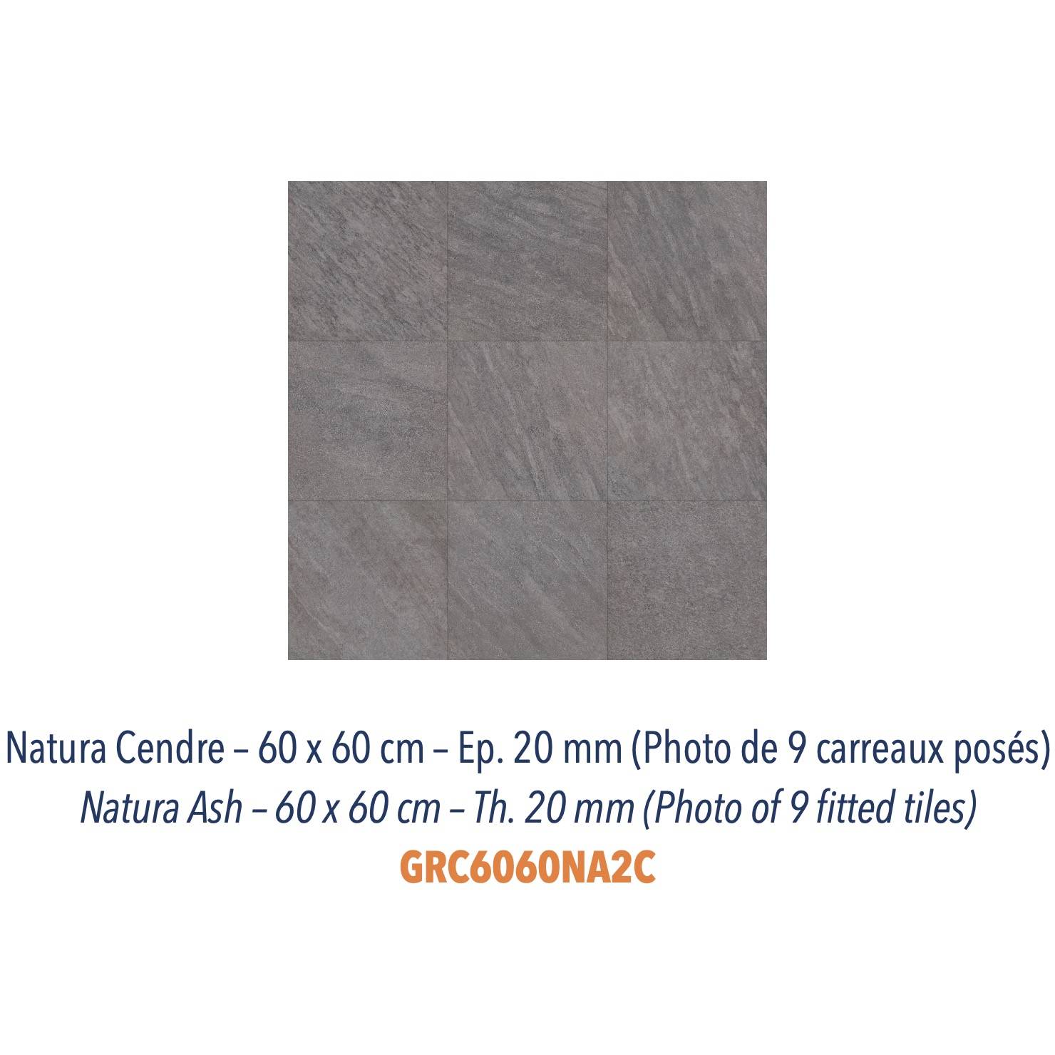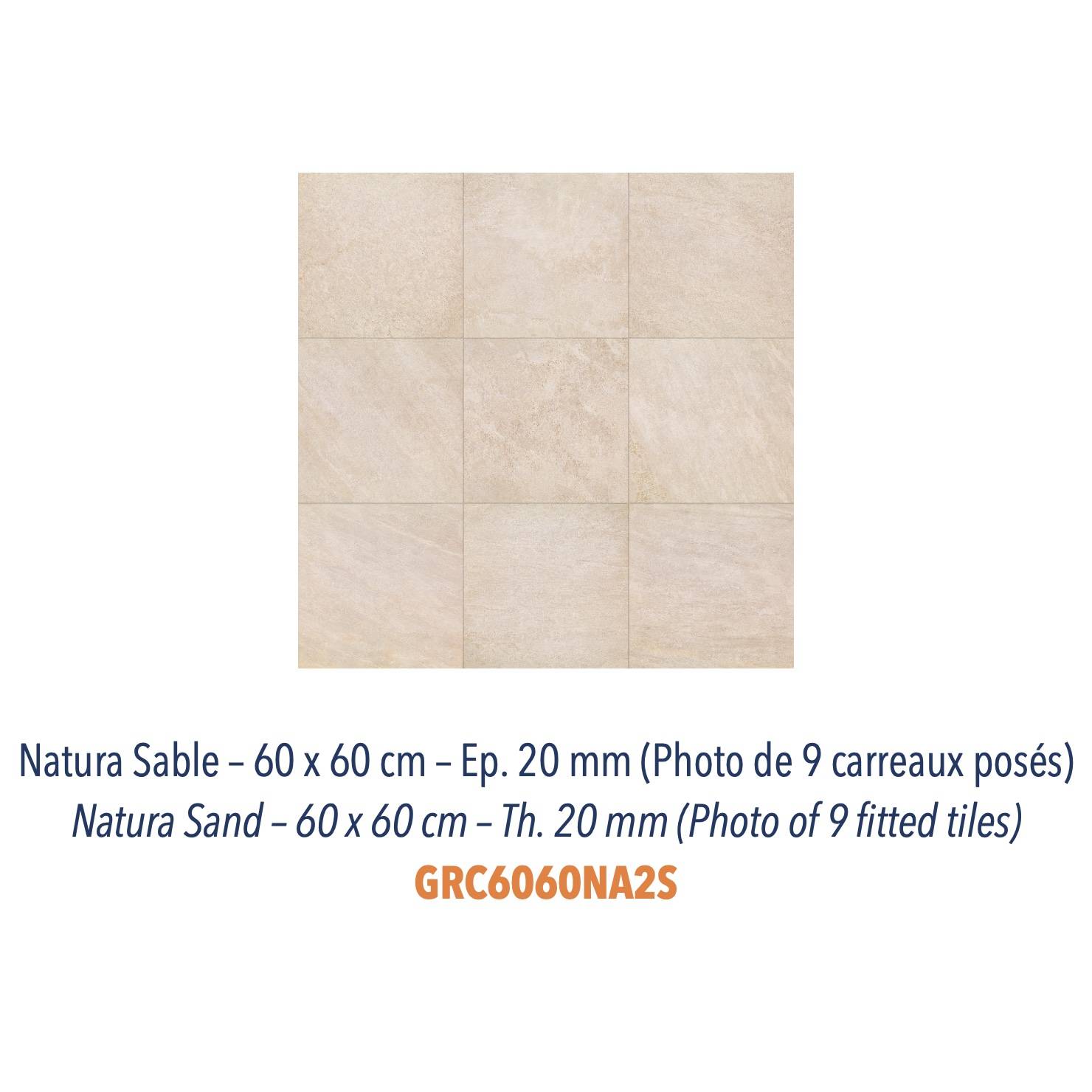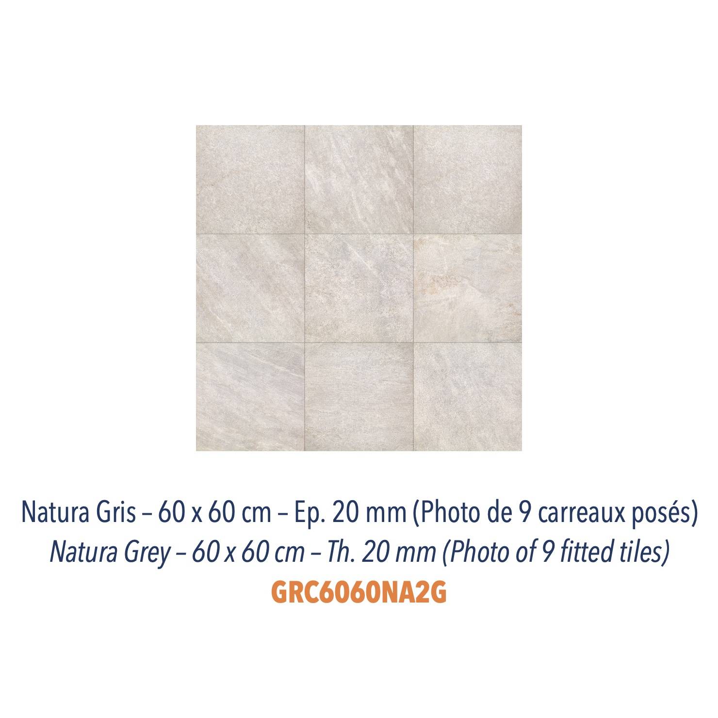 Ces carreaux de 60 x 60 cm sont en grès cérame et font 2 cm d'épaisseur ainsi ils sont très robustes et conviennent parfaitement pour une utilisation dans des endroits carrossables. De plus, les dalles Natura sont rectifiées donc elles sont adaptées pour une pose sur plots.