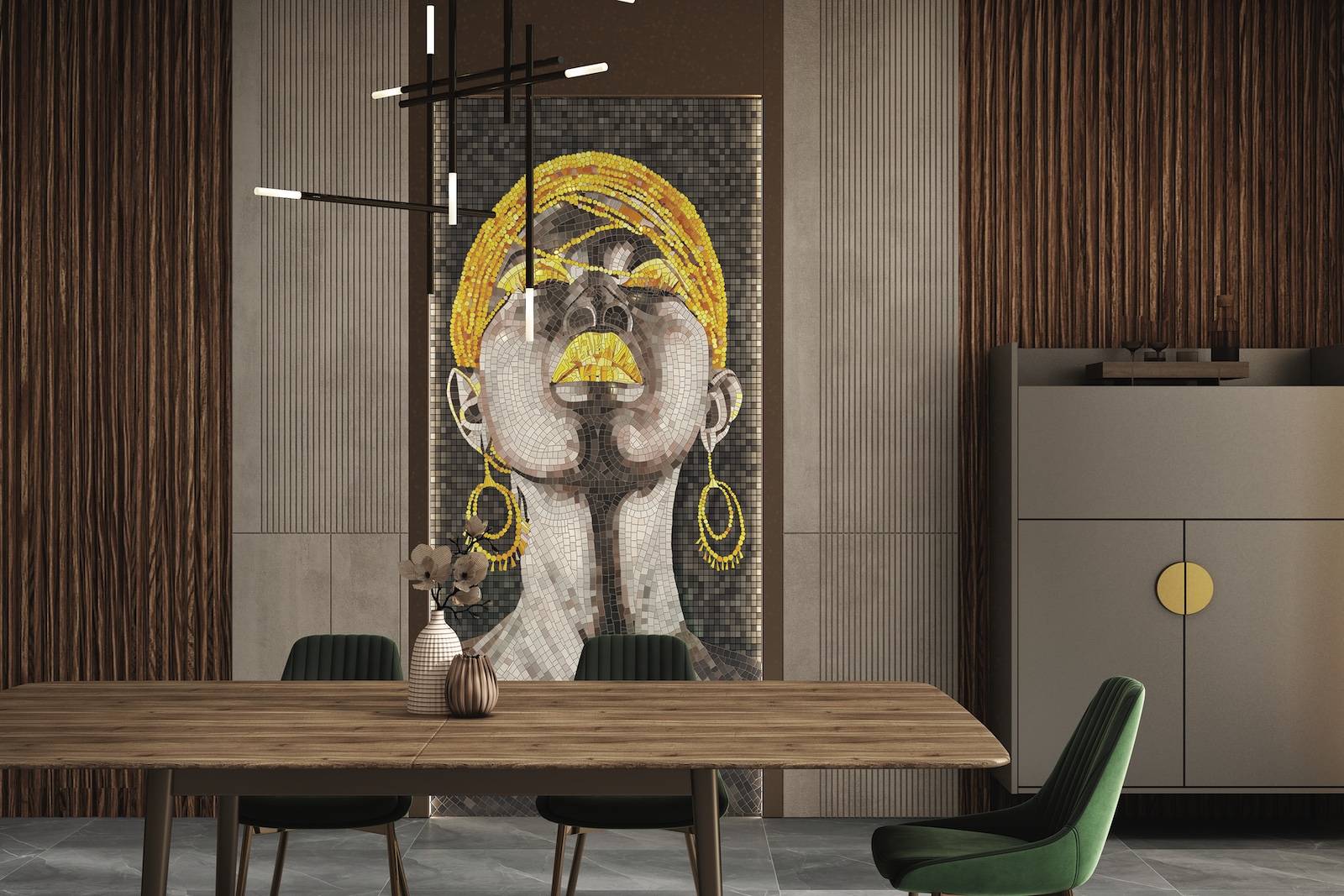 Rosa : Un univers plus sombre et graphique, mêlant noir et jaune pour mettre en lumière la silhouette féminine au centre, offrant un style contemporain et audacieux.