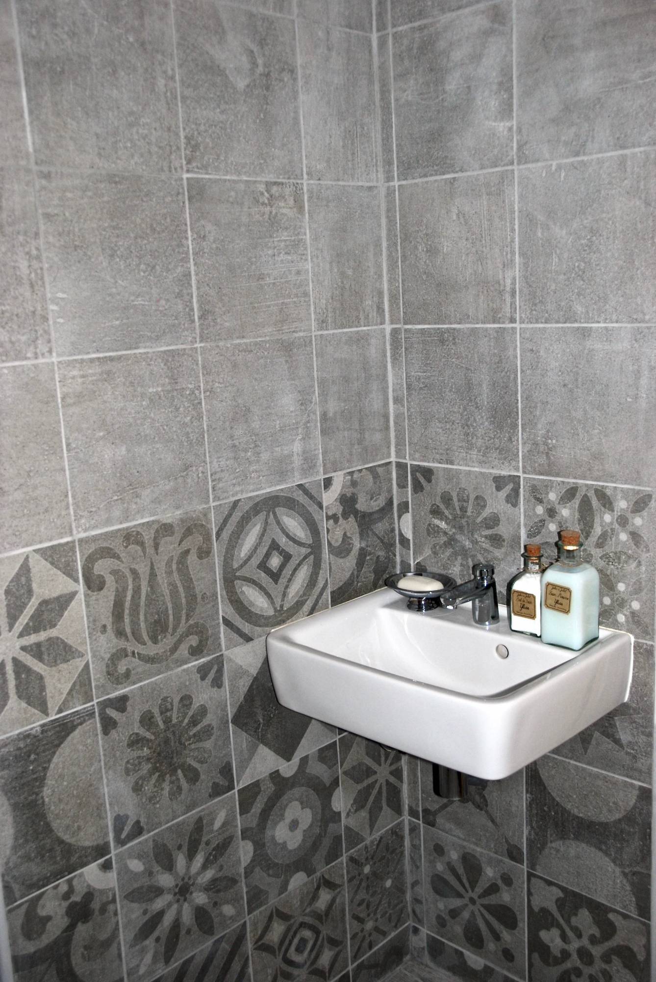 Notre patchwork Signum Grey est posé jusqu'à 1,10m de hauteur puis l'uni Signum Grey est posé jusqu'au plafond.
