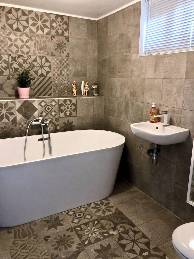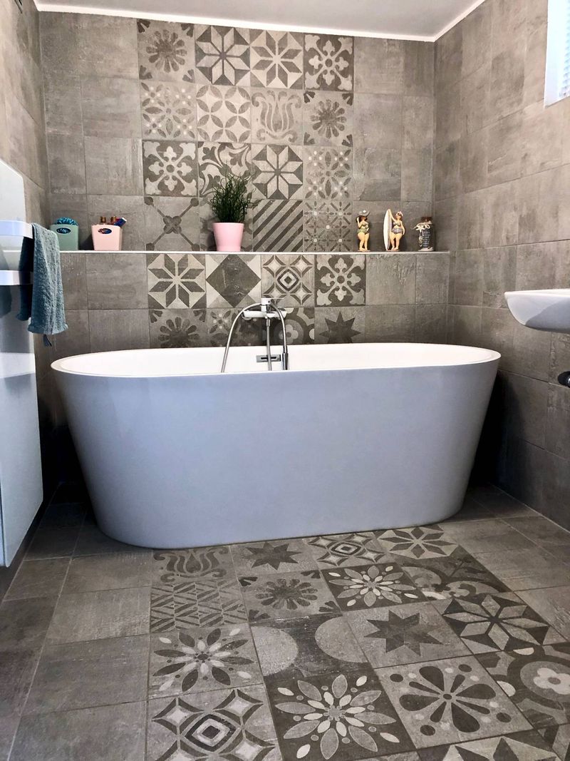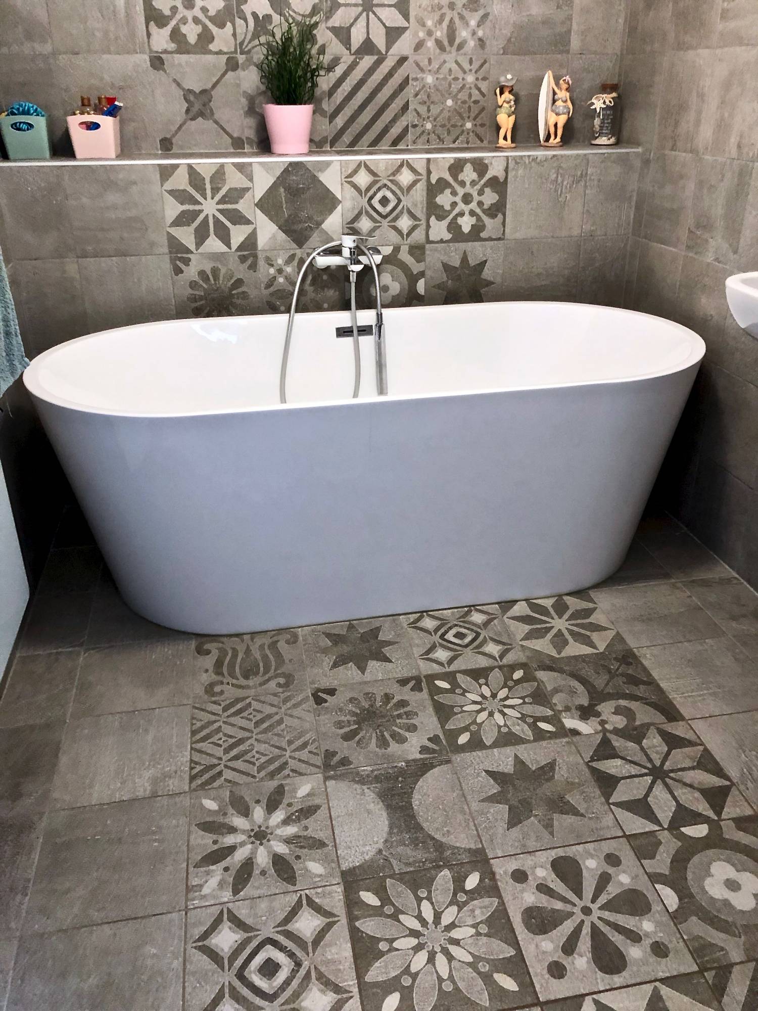 Une frise allant du sol au plafond est présente au centre de la pièce pour mettre en valeur la jolie baignoire blanche. Cette frise est réalisé avec les carreaux de notre patchwork de carreaux en grès cérame Signum.