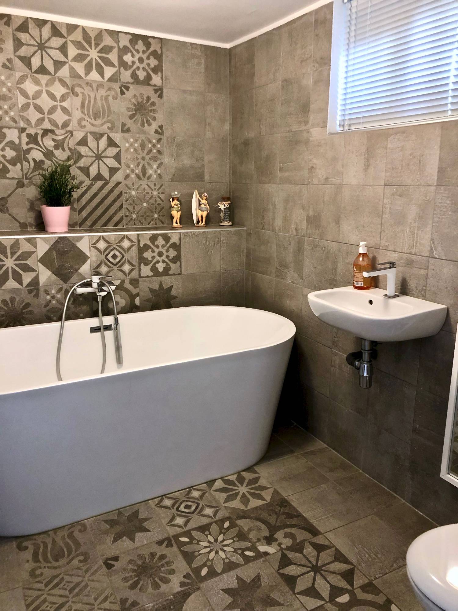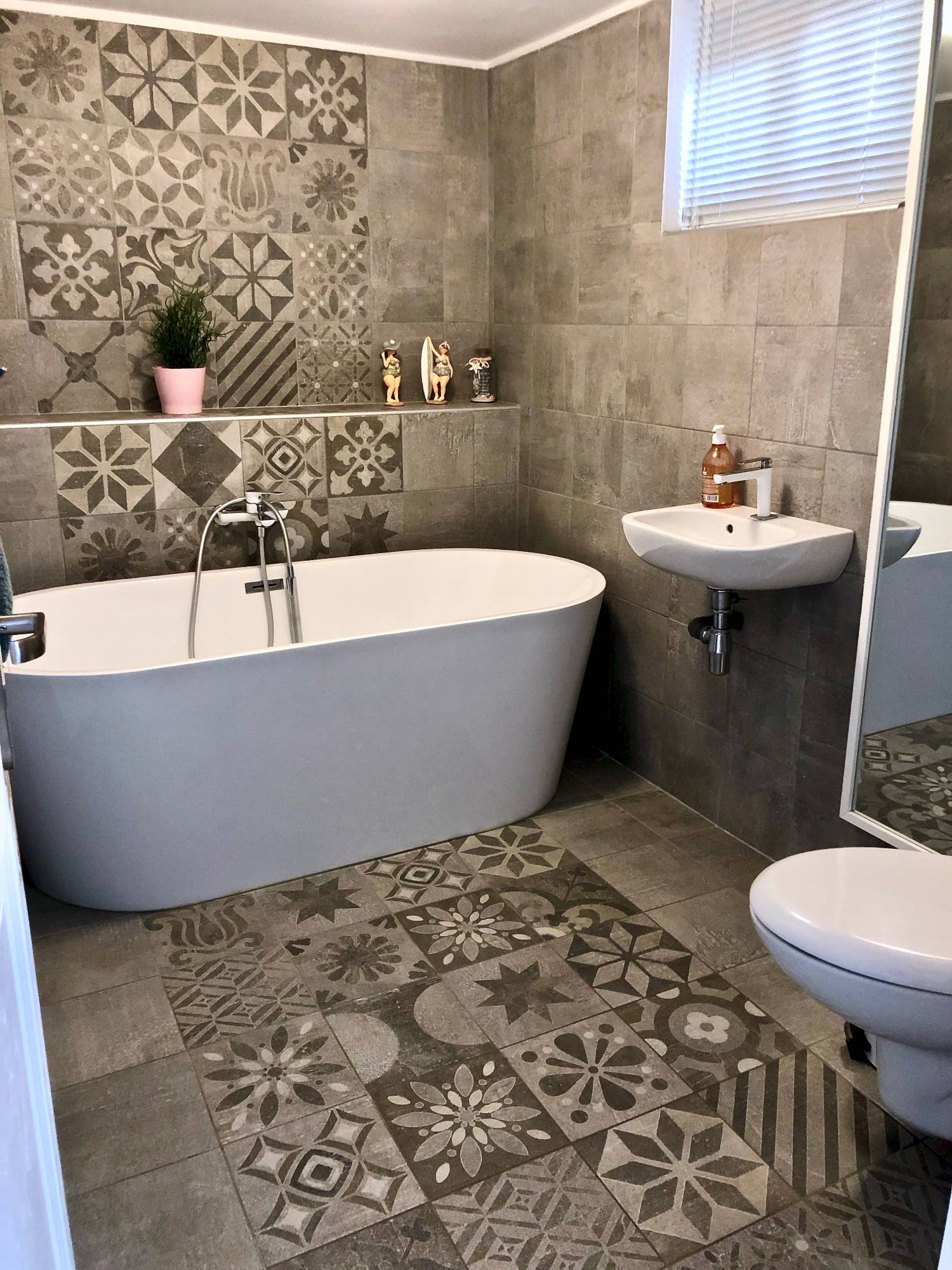 Les carreaux unis Signum Grey rappelle le gris foncé des carreaux du patchwork et donnent un peu de sobriété à cette pièce!