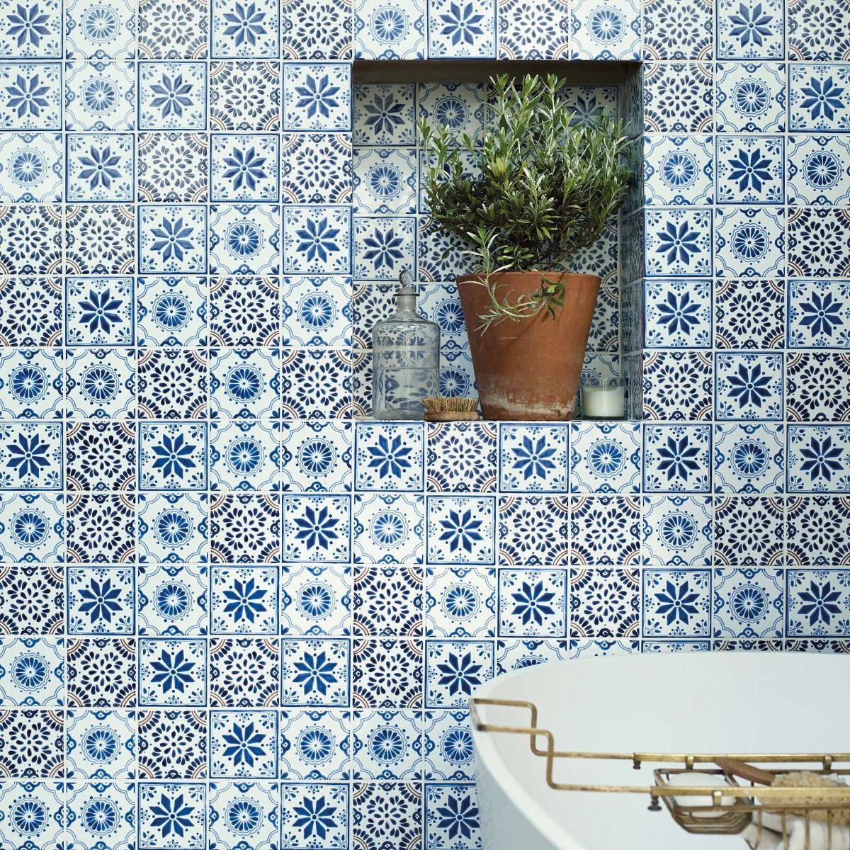 Un patchwork de trois carreaux différents est utilisé dans cette salle de bains. les carreaux sont placés de manière totalement aléatoire. Les dessins orientaux des carreaux et leur répartition inégale sur le mur donne un esprit bohème à la pièce. La sobriété des couleurs: blanc, bleu et une touche de rouge dans le carreau Arena assure le côté chic de l'ensemble.
